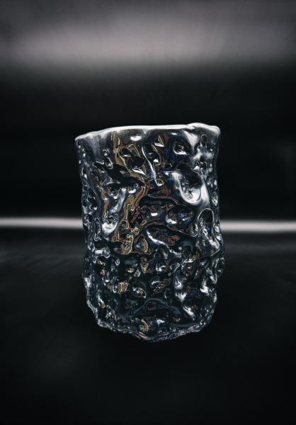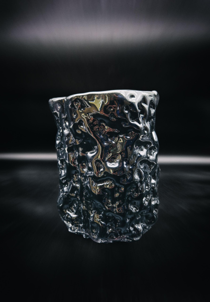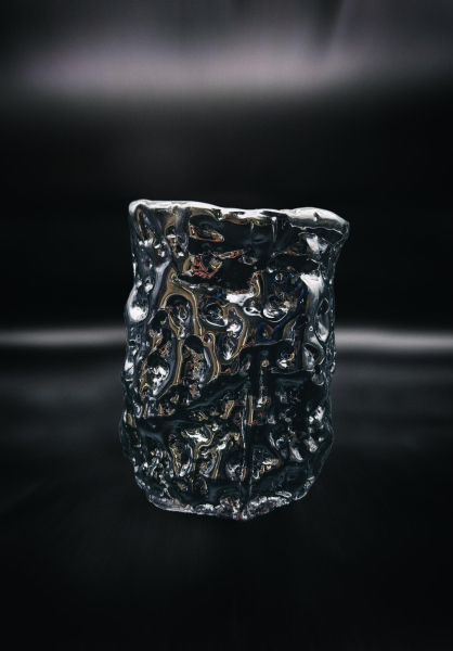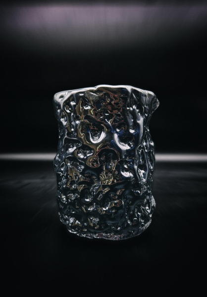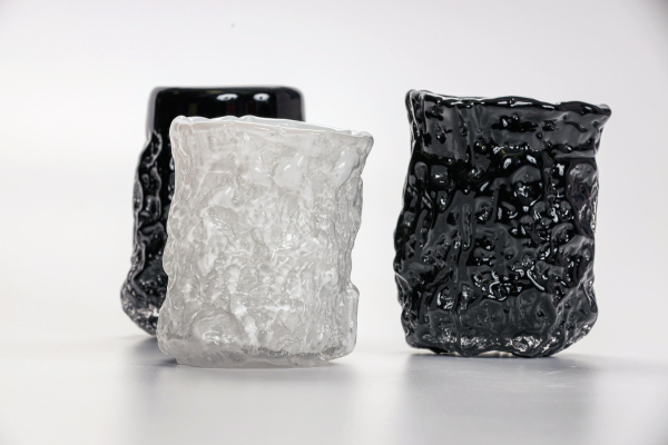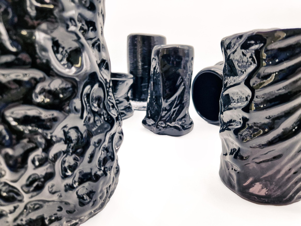 For this project, I arrived in Līvāni with pre-prepared plaster and wooden molds that allowed me to directly influence the forming process. The result was a vessel series titled Swell (Saviļņojums), developed through an exploration of reflections, color, and the ability of form to deform light. Particular attention was given to how glass surfaces distort reflections and how dark tones, especially black, intensify and multiply these visual effects.